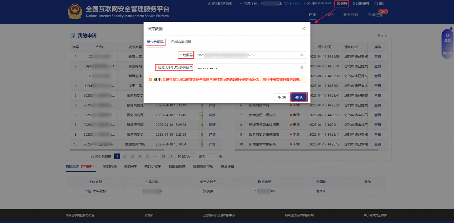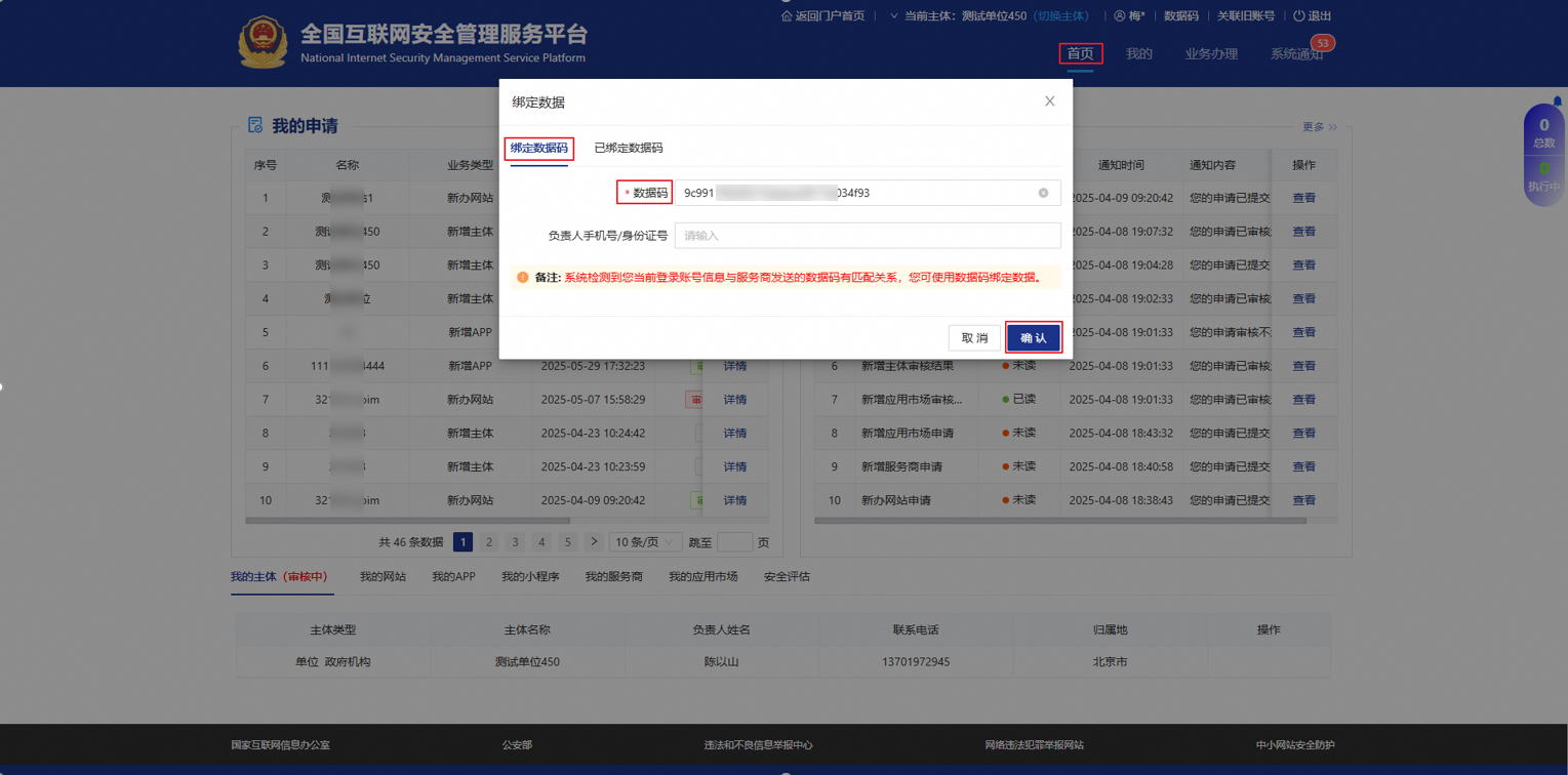 登录全国互联网安全管理服务平台,进入系统首页绑定数据码。系统会根据登录账号与服务商数据码的匹配关系自动处理: