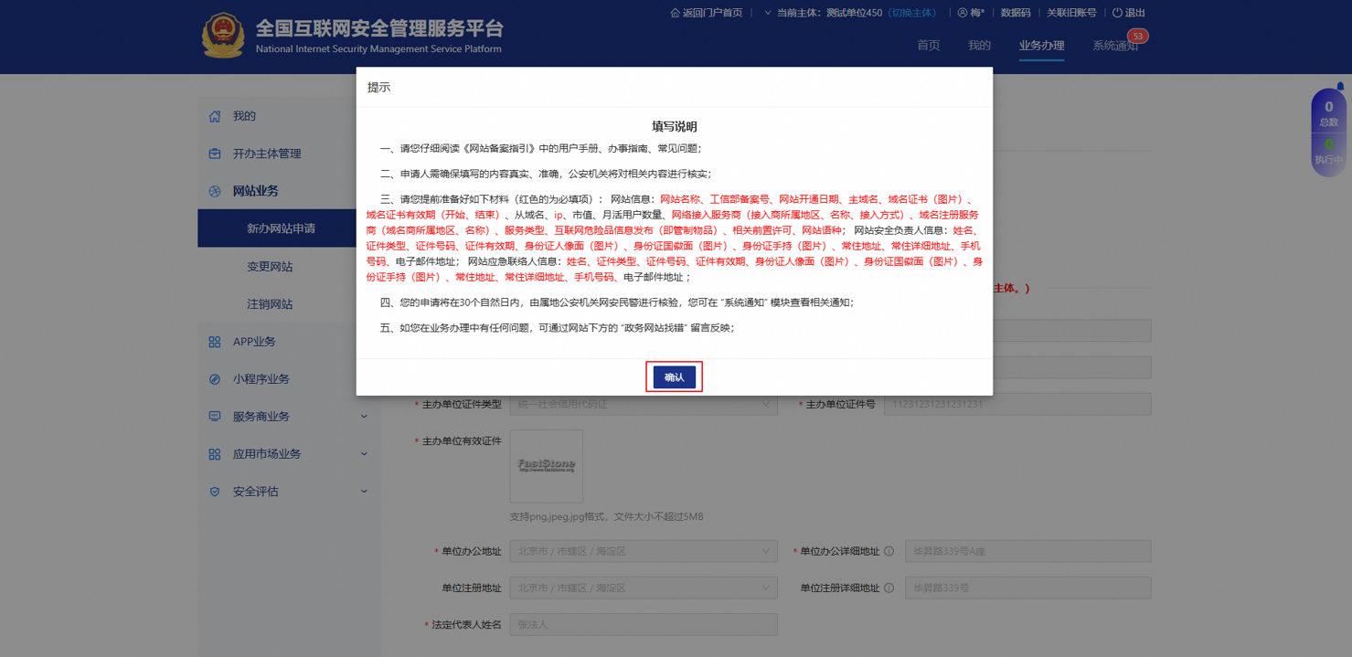 单击创建网站,系统将自动创建网站草稿,并跳转至新办网站申请页面。