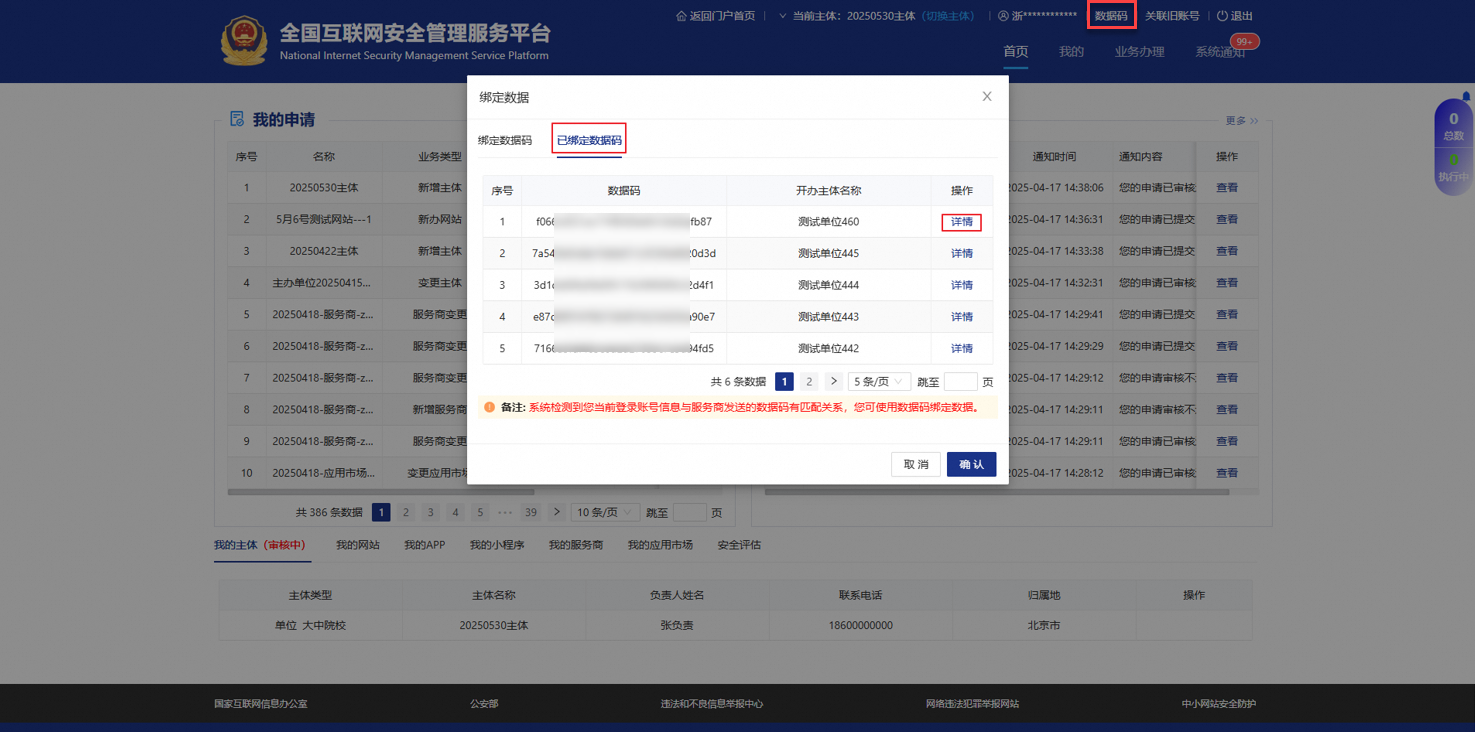 登录全国互联网安全管理服务平台,单击页面右上角数据码,弹出绑定数据对话框,在已绑定数据码页签查看已绑定的数据码列表。