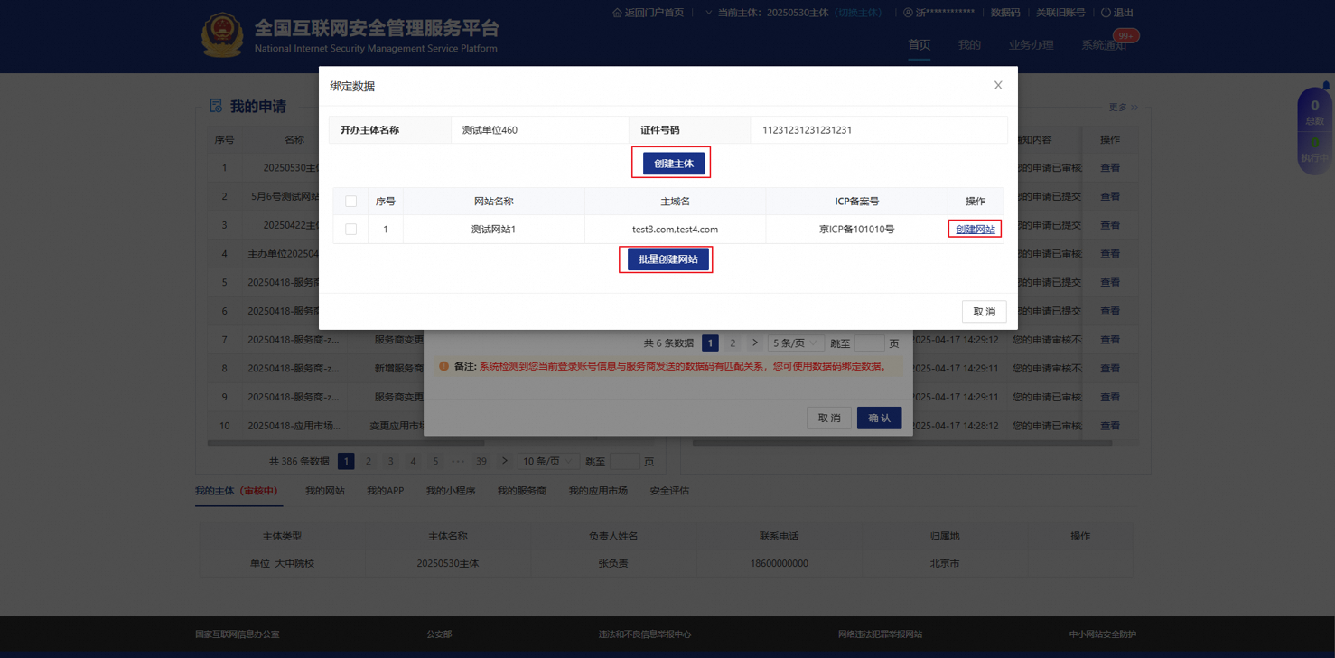 进入绑定数据页面,创建主体和网站。