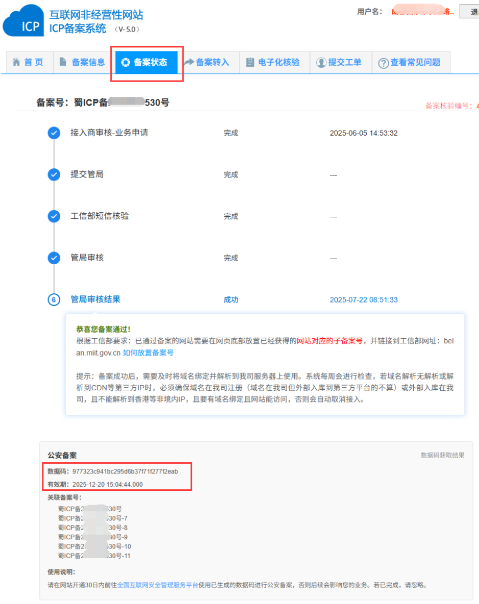 3、待ICP备案审核通过后,可在“备案状态”页面查看数据码;