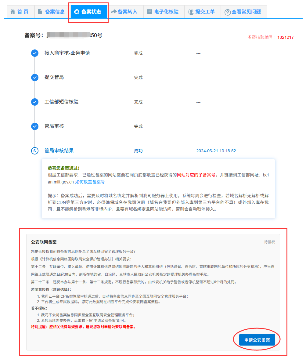 2、提交备案后,在“备案状态”页面选择“申请公安备案”进行授权;
